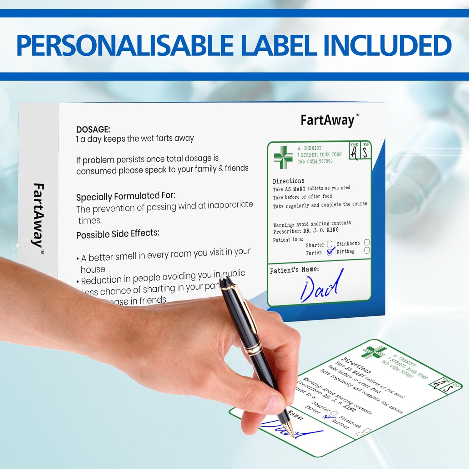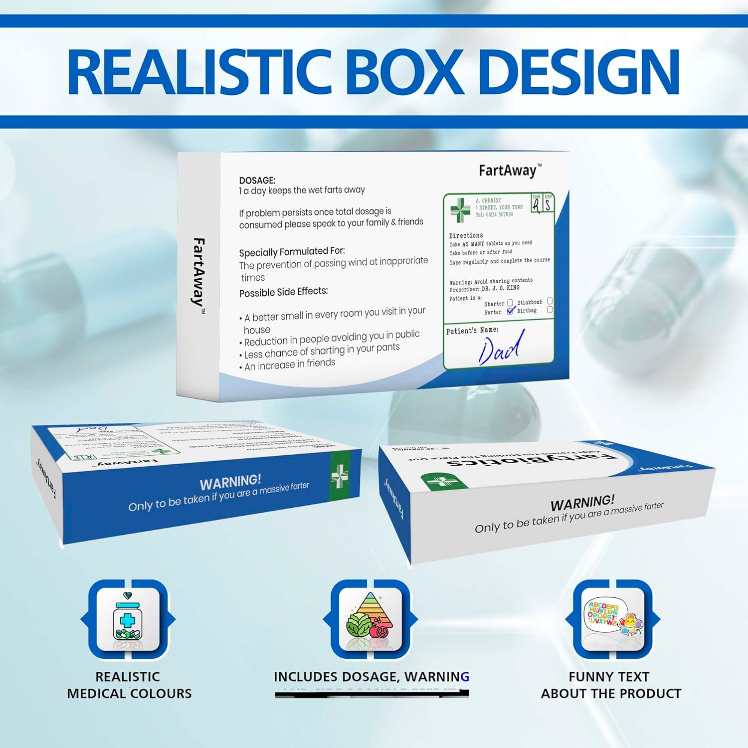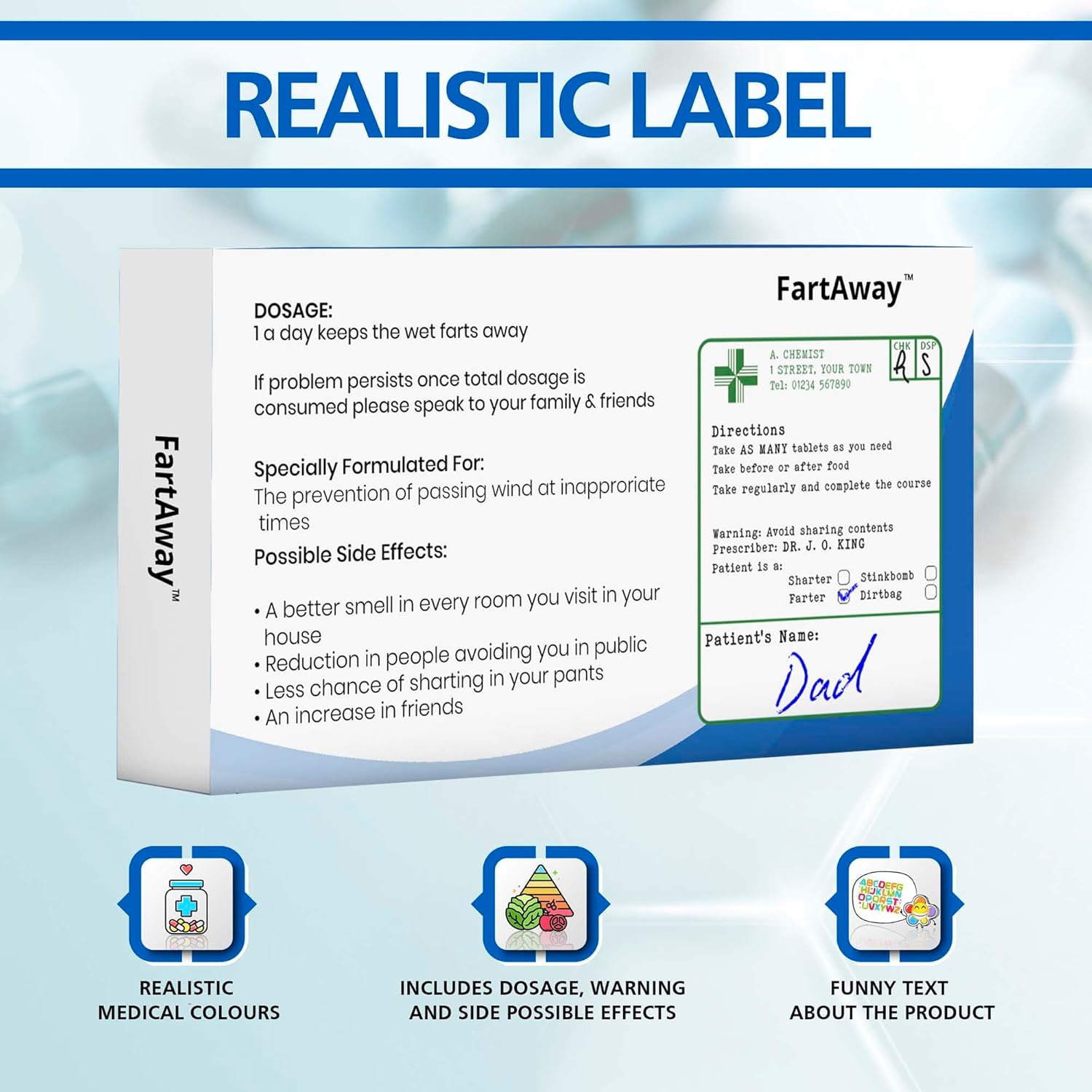 Every box includes a “medicinal sticker” which has a place for you to write your “patient’s name” and also tick which type of joke illness or ailment they are suffering from. This really makes this a very personalised gift and the perfect idea for a birthday, father’s day, retirement from work or even Secret Santa!