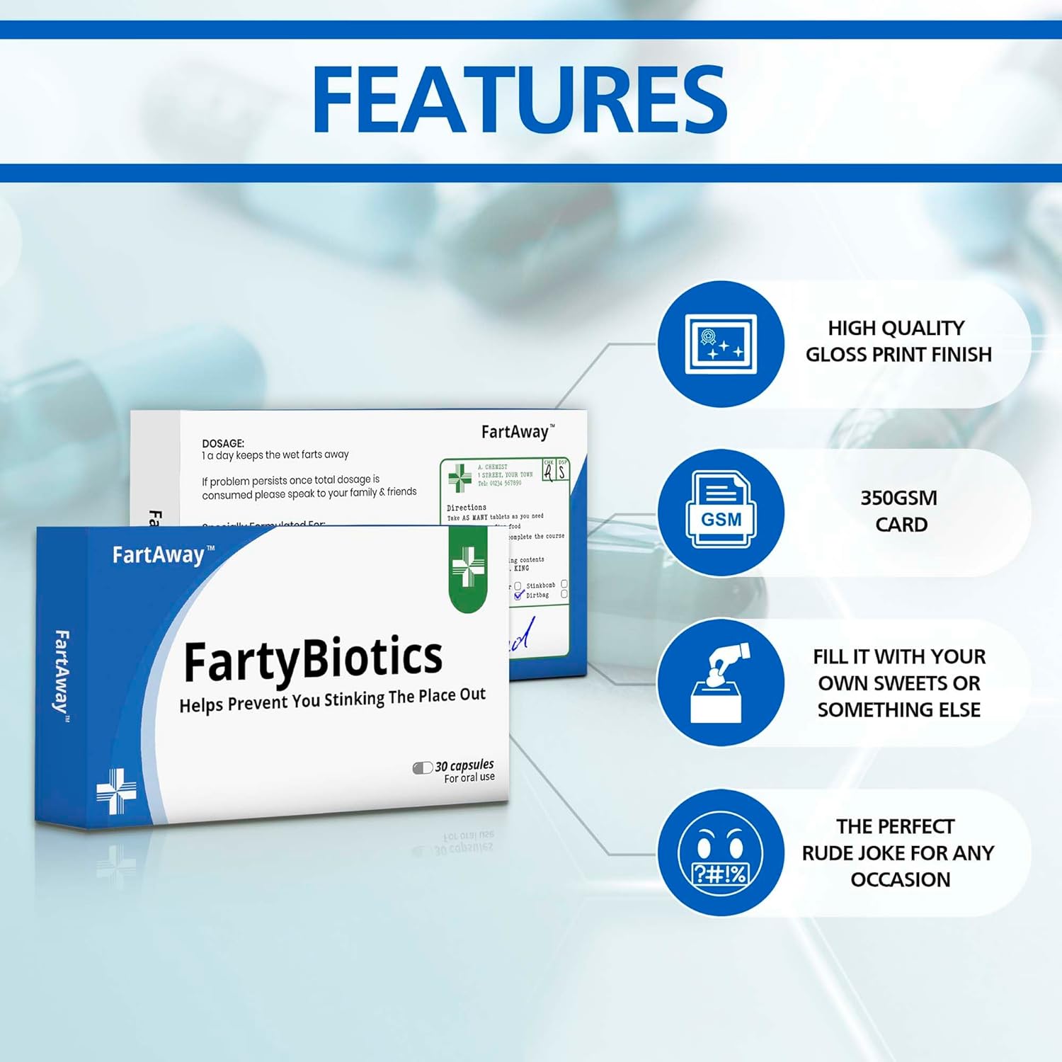 Empty medication box, that comes with a bag and prescription label. Box supplied empty so you can put sweets, money, or any other small gifts inside.