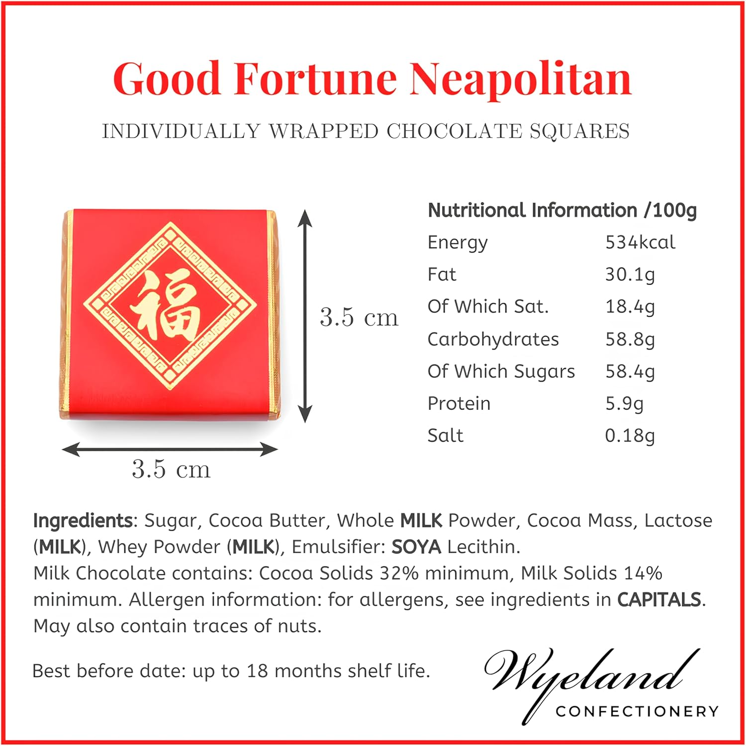 Milk chocolate neapolitans featuring a traditional ‘Good Fortune’ message and design. These make the perfect additions for Chinese New Year celebrations and more!