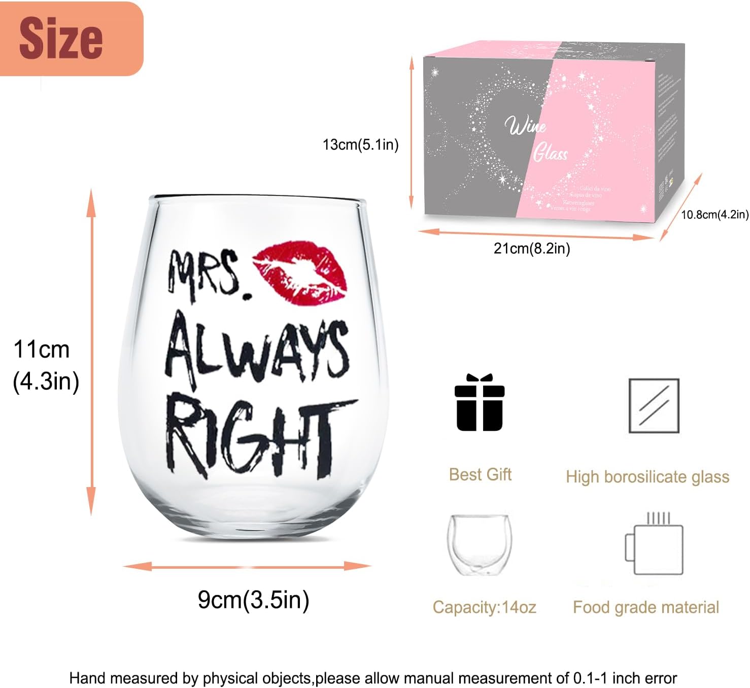 🍻Wine glasses design: Length: 9 cm/3.5 inches Height: 11 cm/4.3 inches. 400ml / 14oz capacity. The wine glasses made of High borosilicate glass, LEAD Free