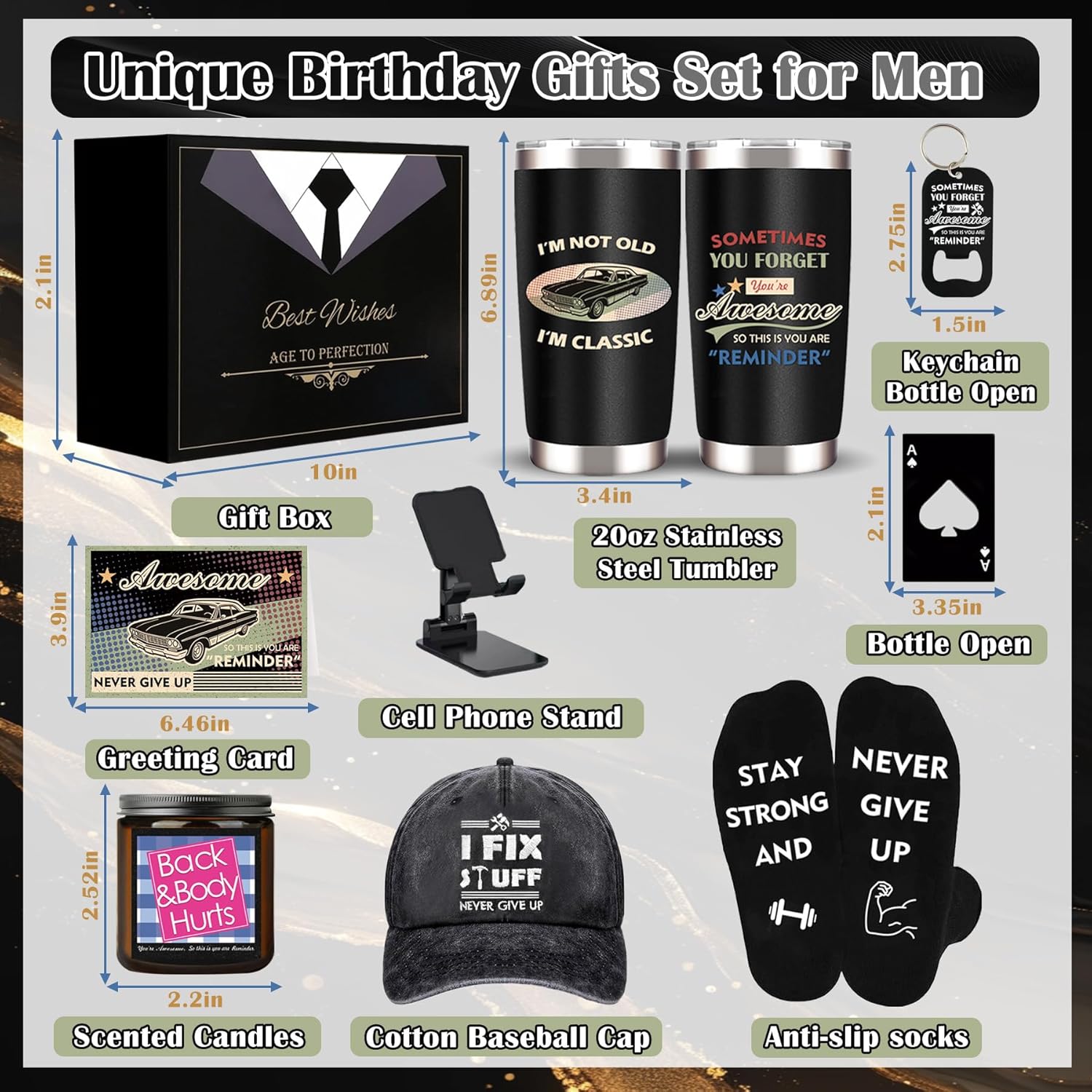 【GIFTS FOR MEN WHO HAVE EVERYTHING】The mystery gift boxes for men includes |1*20oz Car Tumblers | 1*Baseball Hats| 1* Cotton Socks | 1* Keychain Bottle Opener| 1* A Beer Bottle Open | 1*Phone Holder | 1* Happy Birthday Card | all thing put in a personalized box package with some colorful raffia paper filling. Every item is carefully selected with good quality and special design to give him a suprise.